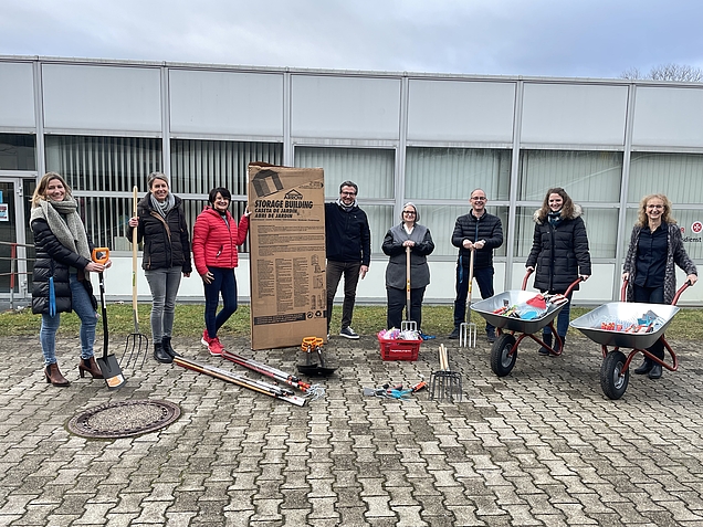 Für solch ein großes Vorhaben sind jede Menge Gartengeräte erforderlich! Erfreulicherweise haben sich mit der Firma Fetscher und dem (Hage-)Baumarkt Schneider zwei großzügige Spenden-/Förderpartner gefunden! Von ihnen erhält das AckerProjekt neben zahlreichen Gartengeräten auch eine dringend benötige Gerätehütte, um die Geräte unterzustellen. „Wir finden es wichtig, dass die Kinder wieder lernen, woher das Gemüse stammt und was es bedeutet Gemüse anzubauen“, so Frau Chira vom Hagebaumarkt Schneider. In puncto biologischem Ackerbau ergänzte Herr Fetscher, „wir haben privat längst komplett umgestellt auf regionale und saisonale Biolebensmittel“, dies zu vermitteln und vorzuleben findet er wichtig und wertvoll.