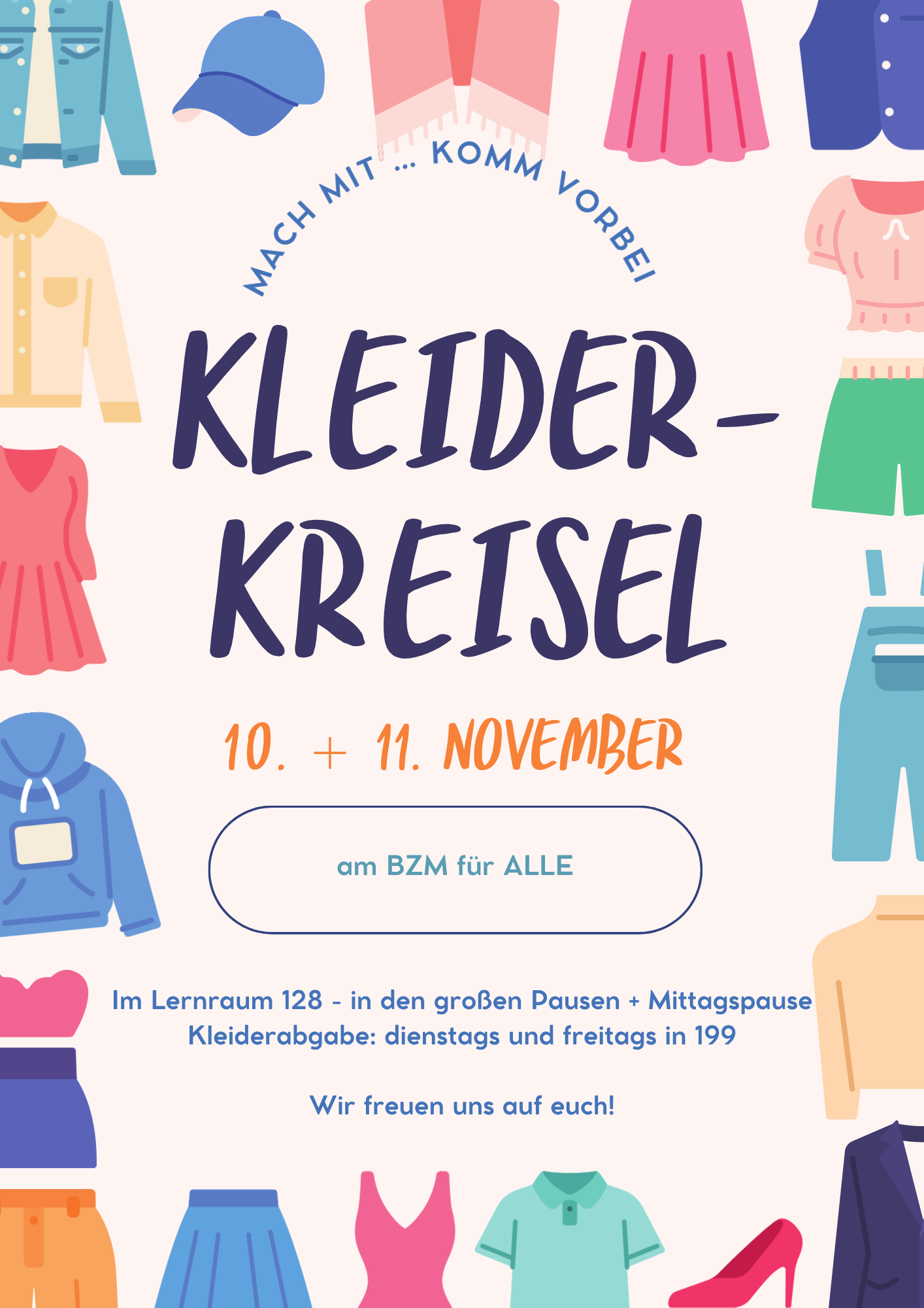Traditionell findet bei uns an der Schule zweimal jährlich eine Kleider-Tausch-Aktion statt.Dieser „Kleiderkreisel“ stößt bei unseren Schülerinnen und Schüler auf große Akzeptanz. Wir wollen an unserer Schule im Sinne der Nachhaltigkeit ein Zeichen gegen den verschwenderischen Umgang mit Kleidung setzen und gut erhaltene Kleidung einfach weitergeben. Es wäre großartig, wenn auch Sie unsere Aktion mit gut erhaltenen Kleidern (Größe S/M bzw. 164-176) und schönen Accessoires für Jugendliche unterstützen. Bis zum 24. Oktober freuen wir uns über die Abgabe ihrer Spende: jeden Donnerstag um 14:00 Uhr hinter unserer Bibliothek/Ecke Schulacker. Oder dienstags und freitags in der Schulküche bei Frau Wenger. Unsere Kleider-Aktion findet für alle Schülerinnen und Schüler des BZM am 10.-12. November statt. Ihre Unterstützung ist ein wertvoller Beitrag für das Fortbestehen dieser Aktion! Wir bedanken uns im Voraus für Ihr Mitmachen.
