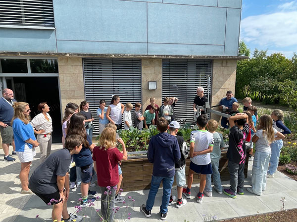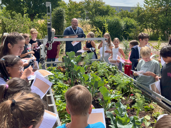 Nach einer Erfrischungspause mit Tischkicker und kühlen Getränken wartete das Highlight: der Farmbot! Ein mit verschiedenen Gemüsesorten bepflanztes Hochbeet, das per Appsteuerung gepflegt wird. Zunächst bestimmten die Fünftklässler alle Pflanzenarten im Beet. Zwei Farmbot-Experten des Unternehmens zeigten den Kindern, dass die Computersteuerung das Hochbeet in ein Koordinatensystem einteilt. Voller Spannung beobachteten wir, wie der Roboterarm über das Beet fuhr, um eine zuvor per App ausgewählte Erdbeer- oder Blumenkohlpflanze zu gießen. Beim abschließenden Quiz galt es dann, Gurken-Koordinaten zu ermitteln – Mathe mal ganz praktisch!