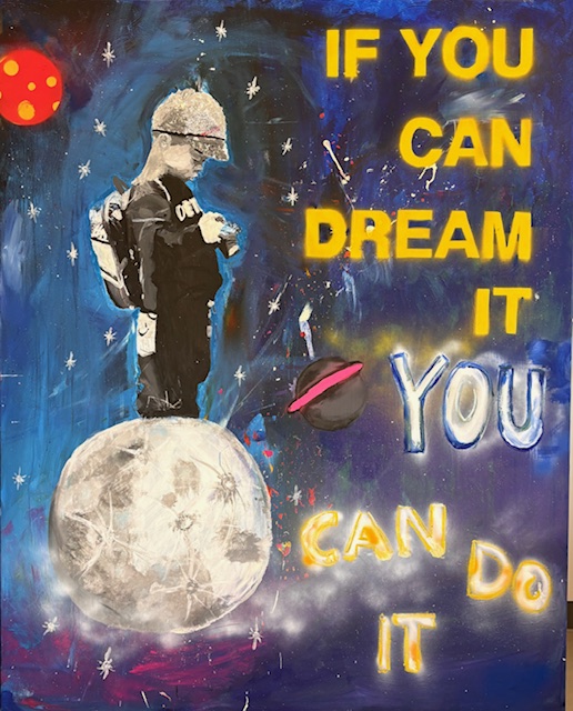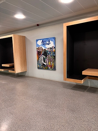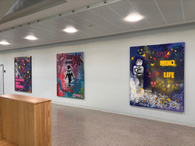 Bereits viele Wochen vor der geplanten Projektwoche am Ende des Schuljahres, startete die Klasse 6B der Realschule mit der Planung ihres Projektes: Street Art auf überdimensional großen Leinwänden (200 cm x160 cm). Ziel war es, Bereiche des frisch sanierten Schulhauses zu gestalten - natürlich aber vorallem: sich kreativ auszutoben. Dafür war die Projektwoche gerade richtig. Da die Leinwände allerdings größer als die Kinder selber waren, wurden im Vorfeld viele Konzepte entwickelt, die Schüler legten die Größe der Leinwände fest, die Größe ihrer Figuren auf den Bildern, bearbeiteten diese bereits in Fotoprogrammen vor, setzten sich in ihren Teams zusammen und wählt letztendlich einen Entwurf, ein Konzept aus. Innerhalb von zwei Tagen war es so möglich, die Leinwände zu gestalten: mit Acrylfarbe, Graffiti, Spraydosen, und Foto-Drucktechnik wurden schrille, aussagekräftige Leinwände gestaltet, die bereits einen Tag später unser Schulhaus zierten.