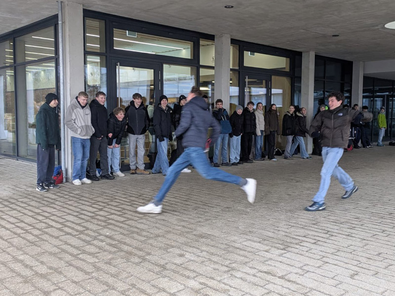 Zurück an der Schule, es regnete immer noch, haben wir das italienische Spiel „ruba bandiera“ gespielt, bei dem es darum geht, ein Tuch vor der anderen Mannschaft zu schnappen und in Sicherheit zu bringen.